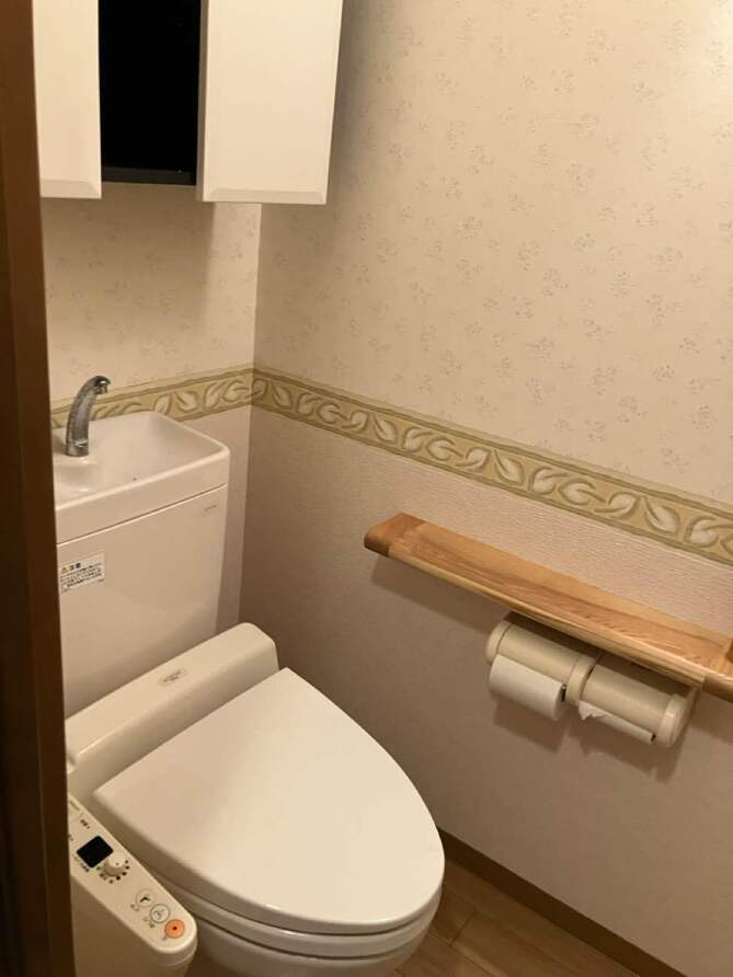 トイレ本体は新しいものに入れ替え、背面には棚付きの手洗い器を新設しました。収納と手洗いが一体になっているため、見た目がすっきりするだけでなく、使い勝手も向上しています。